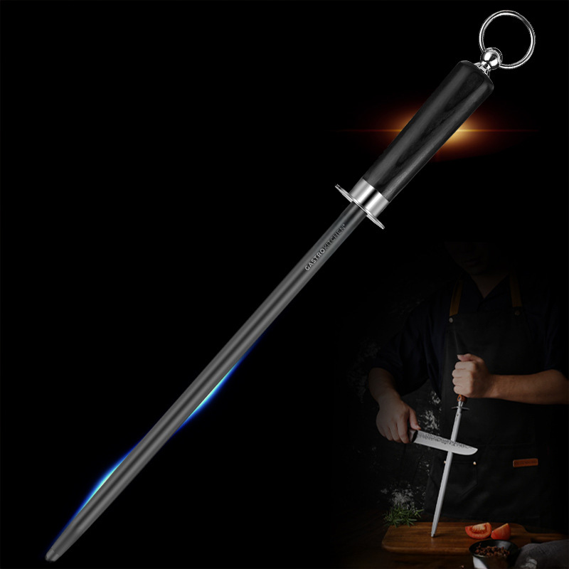 Oțelul de ascuțit cu granulație ultrafină #6000 reface rapid micro-dinții tăișului fără a îndepărta agresiv materialul. Oțelul carbon înalt călit (≈ 64 HRC) este acoperit cu microcorund, ideal pentru întreținerea zilnică a cuțitelor de bucătar și măcelar. Mânerul ergonomic din abanos cu gardă cromată protejează degetele, iar agățătoarea din oțel permite depozitarea pe suport în bucătăriile profesionale.