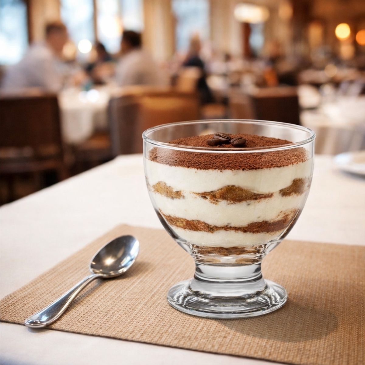 - Versatilitate – paharul este ideal pentru servirea deserturilor precum tiramisu, trifle sau cupe de înghețată, iar forma sa susține aranjarea estetică a straturilor de ingrediente