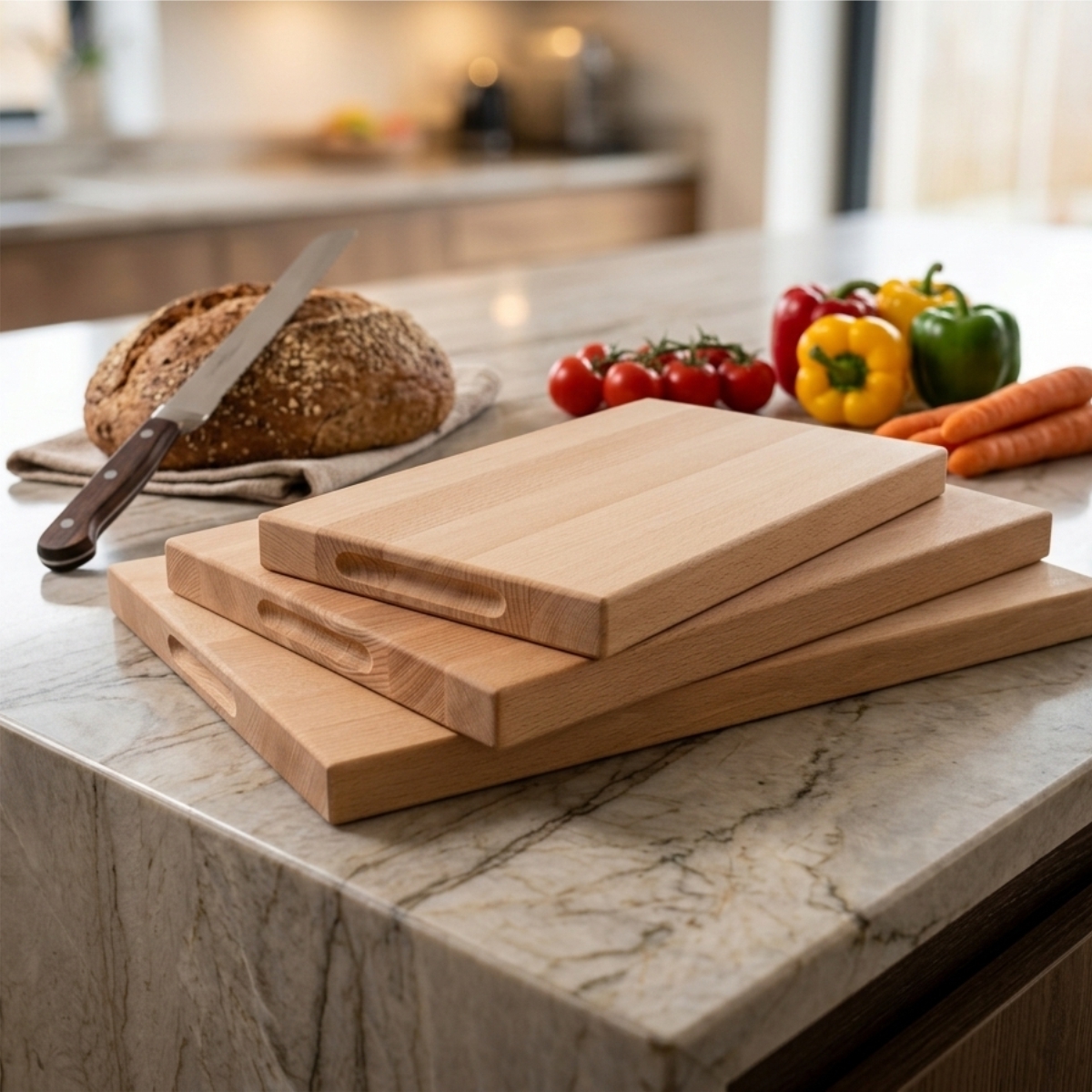 Mânerele laterale facilitează transportul și manipularea, iar suprafața tratată cu ulei alimentar protejează lemnul la utilizare intensă și evidențiază textura naturală.