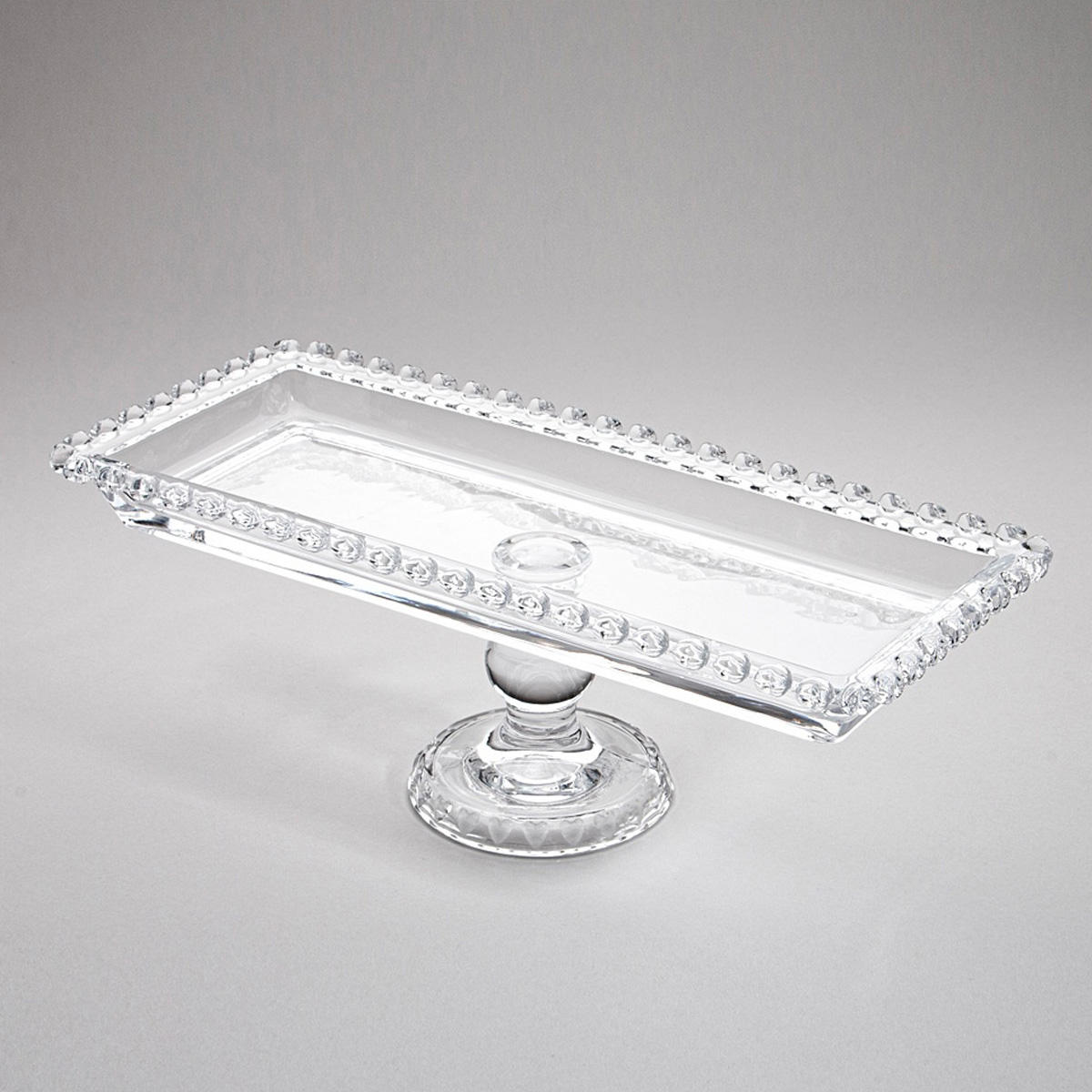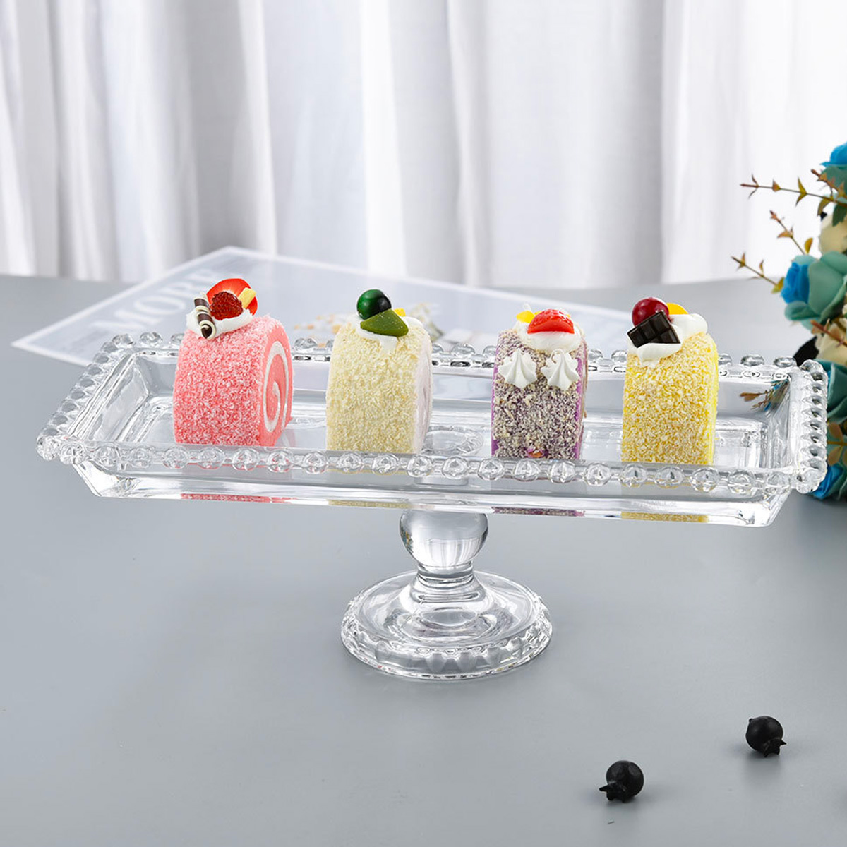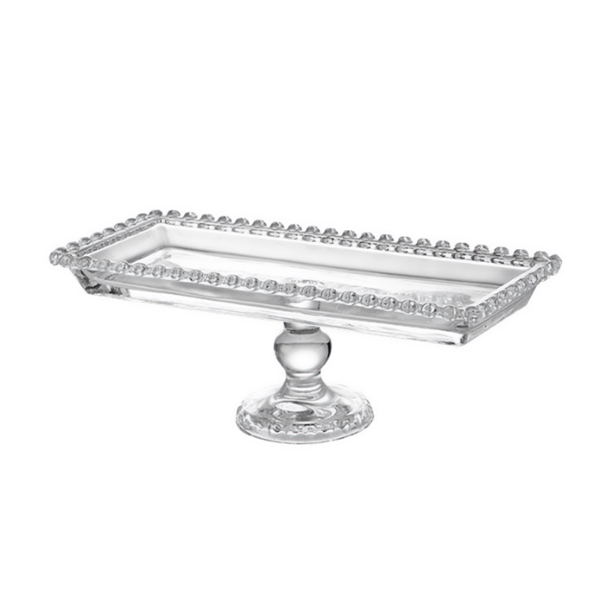 Platoul dreptunghiular din sticlă, cu design elegant, este perfect pentru servirea rafinată a torturilor, prăjiturilor sau aperitivelor. Datorită suportului înălțat și marginii fin decorate, adaugă stil și rafinament oricărei mese. Recomandat pentru restaurante, cofetării, nunți, petreceri sau catering.