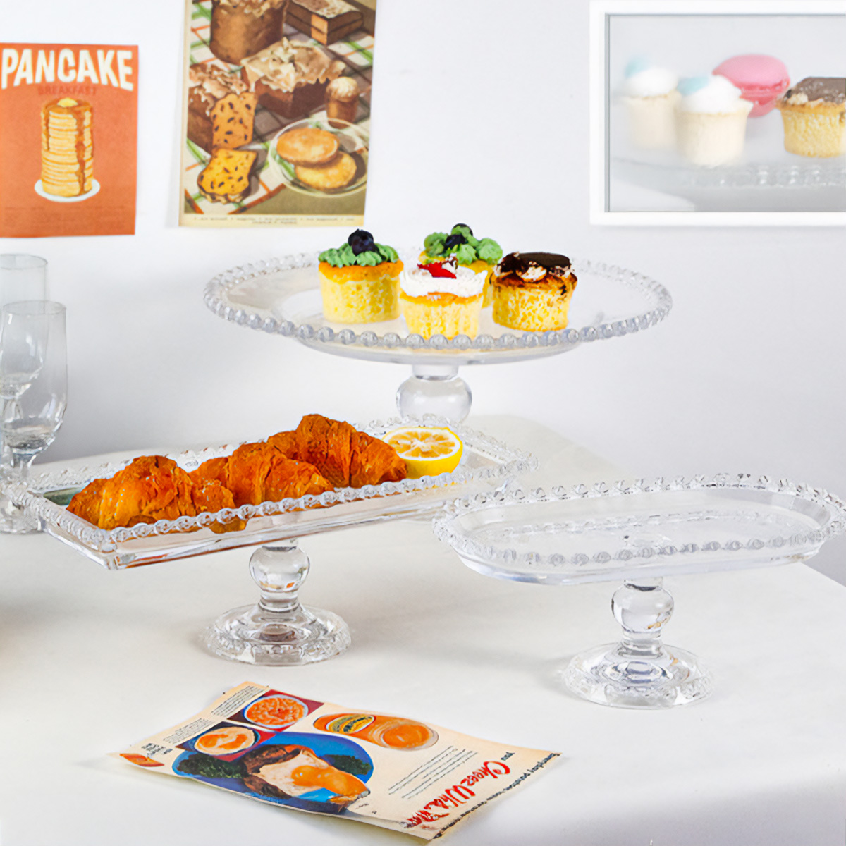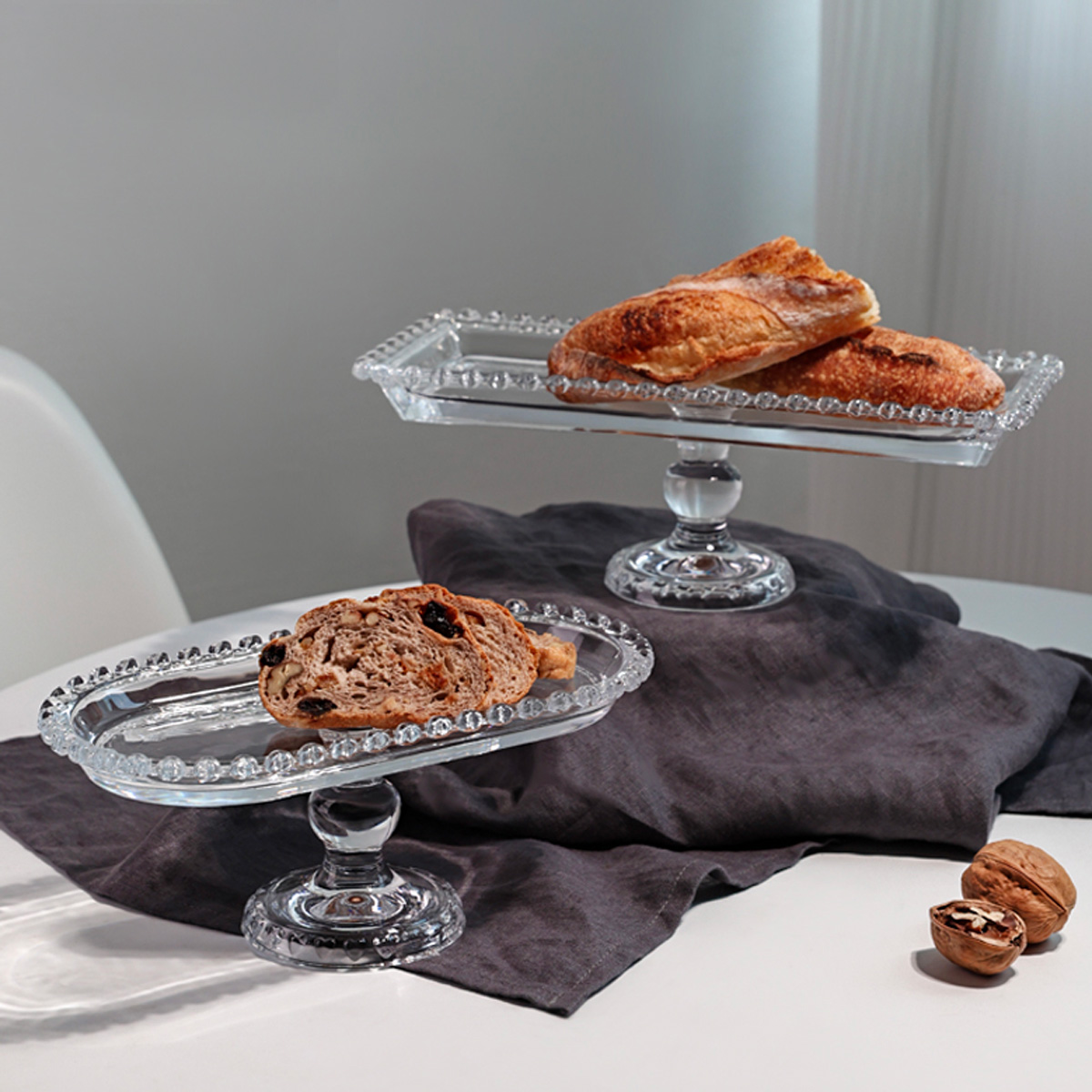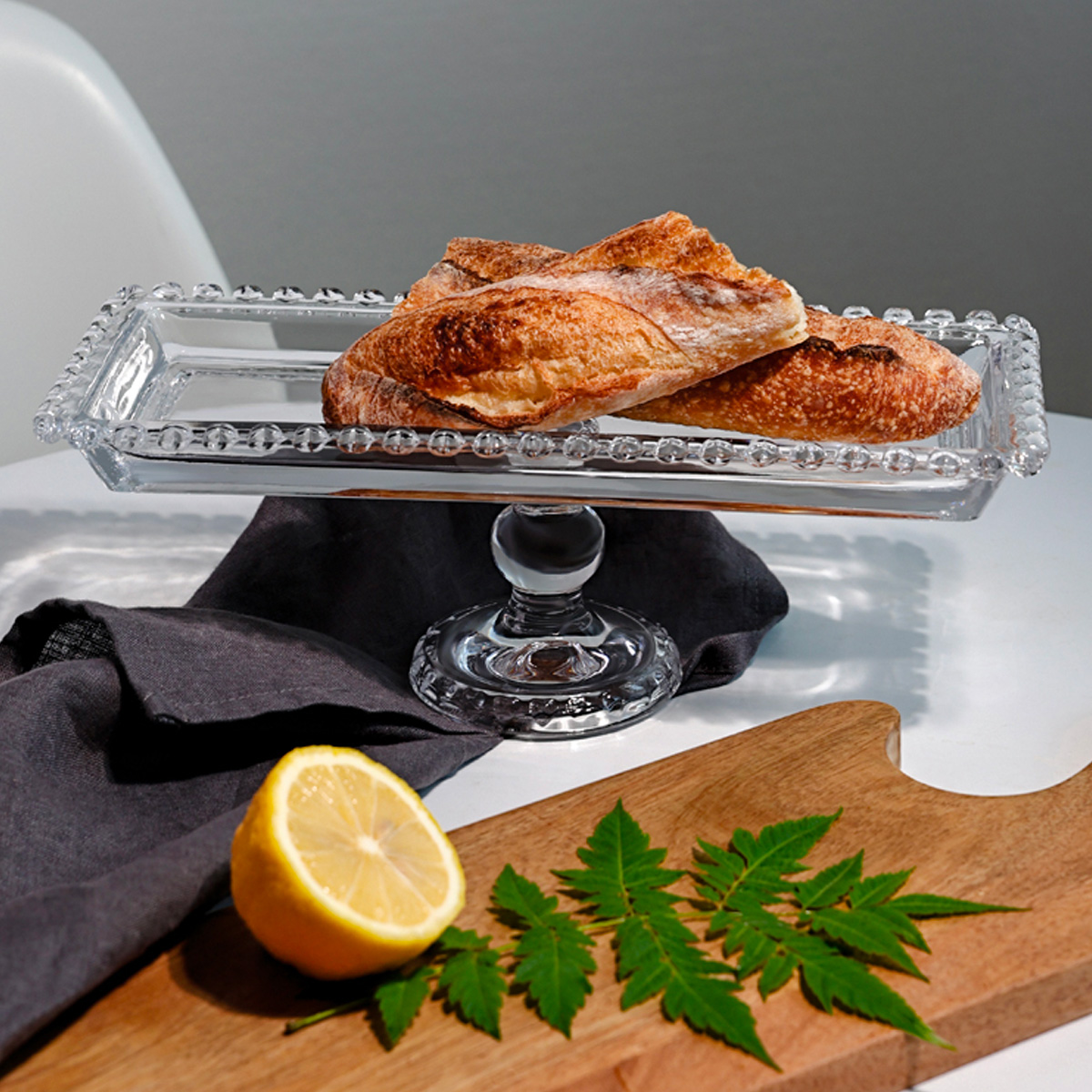 Platoul dreptunghiular din sticlă, cu design elegant, este perfect pentru servirea rafinată a torturilor, prăjiturilor sau aperitivelor. Datorită suportului înălțat și marginii fin decorate, adaugă stil și rafinament oricărei mese. Recomandat pentru restaurante, cofetării, nunți, petreceri sau catering.