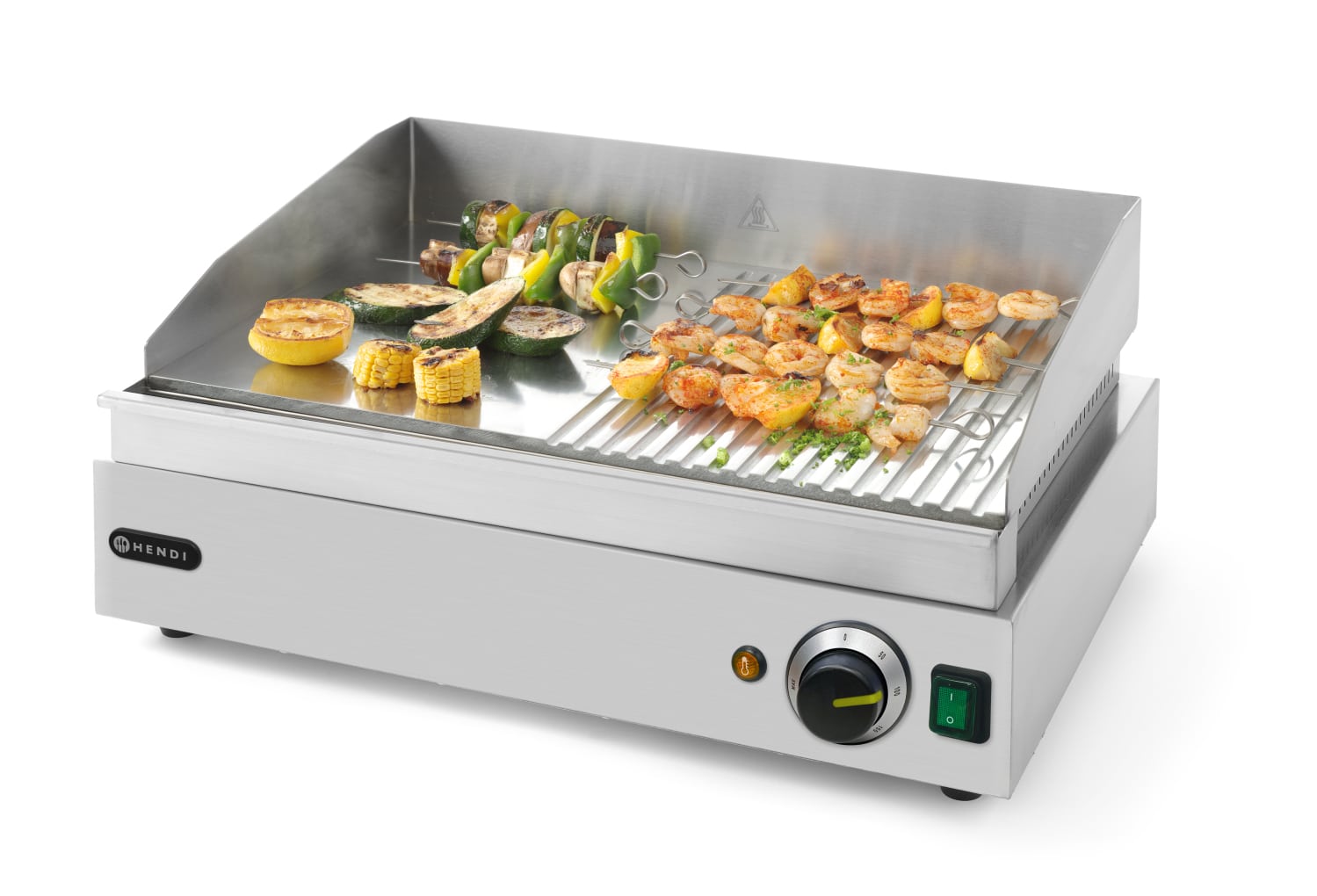 Plită grill Blue Line de la Hendi cu suprafață 1/2 netedă și 1/2 striată. Recomandată pentru restaurante mici și mari, ideală pentru bucătării profesionale, utilizare exclusivă la interior. Calitate superioară, finisaje excelente și funcționalitate deosebită – produsele Hendi sunt alegerea perfectă pentru orice bucătărie HoReCa.