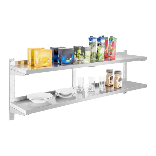 Polița de perete RCWR-160.2 cu două suprafețe de depozitare de la Royal Catering vă permite să organizați eficient ustensilele de bucătărie precum oale, vase și ingrediente. Cu o lungime de 160 cm și o adâncime de 30 cm, vă ajută să mențineți ordinea în orice bucătărie profesională. Designul poliței este simplu și practic, iar suporturile se montează foarte ușor pe perete. Datorită posibilității de reglare pe înălțime, puteți monta ambele rafturi la distanța dorită, adaptându-le nevoilor dumneavoastră. Montajul pe perete economisește spațiu și vă oferă libertate maximă de mișcare și utilizare optimă a spațiului de lucru. Spre deosebire de dulapurile închise, obiectele de pe poliță sunt mereu la îndemână. Suporturile oblice de sub raft asigură o stabilitate excelentă, astfel încât puteți depozita chiar și obiecte grele. Polița este fabricată din oțel inoxidabil de calitate superioară, ceea ce îi conferă un aspect modern și permite o curățare ușoară, fiind ideală pentru restaurante, bucătării profesionale și alte unități HoReCa.