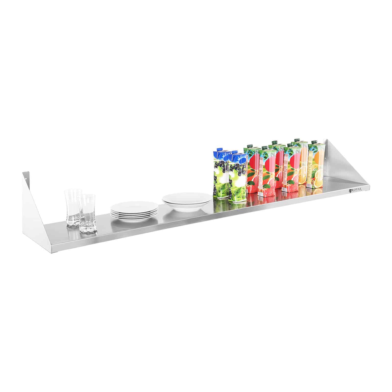 Polița de perete RCTR-180 de la Royal Catering oferă spațiu de depozitare practic pentru orice tip de veselă sau ustensile de bucătărie și, datorită suprafeței generoase de 180 x 30 cm, vă ajută să economisiți mult spațiu. Este fabricată din oțel inoxidabil robust, ușor de curățat și cu o capacitate mare de încărcare. Cu această poliță de perete, menținerea ordinii în orice bucătărie devine mult mai simplă. Construcția poliței este nu doar simplă, ci și practică, fiind compusă din trei piese separate. Cele două laterale înclinate se montează pe perete cu ajutorul șuruburilor incluse. Lateralele mari previn căderea ustensilelor de bucătărie chiar și în cele mai aglomerate momente. Polița este foarte stabilă și fiabilă, iar datorită ranforsării speciale, este potrivită și pentru obiecte grele. Se poate monta pe orice perete și vă oferă mai mult spațiu pentru mobilier și suprafețe de lucru. Practicitatea acestei polițe constă și în faptul că aveți mereu la îndemână obiectele depozitate. Un alt avantaj este materialul rezistent, de pe care murdăria se îndepărtează ușor. Polița se remarcă și prin designul modern, potrivit pentru orice bucătărie profesională sau laborator.