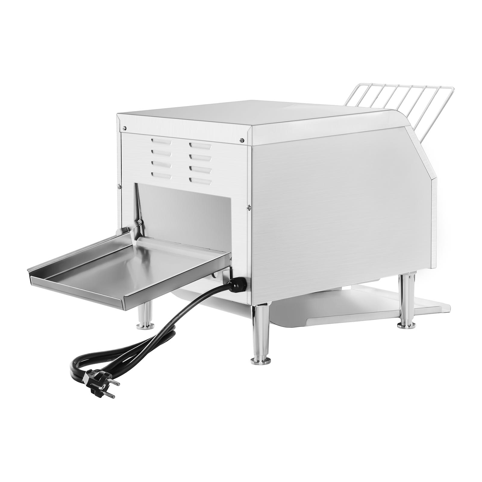 Patru picioare reglabile din inox asigură stabilitate pe orice suprafață. Pâinea poate fi scoasă fie prin deschiderea frontală, fie prin tava suplimentară laterală. Ventilatorul integrat asigură răcirea optimă și previne supraîncălzirea aparatului în utilizarea zilnică.