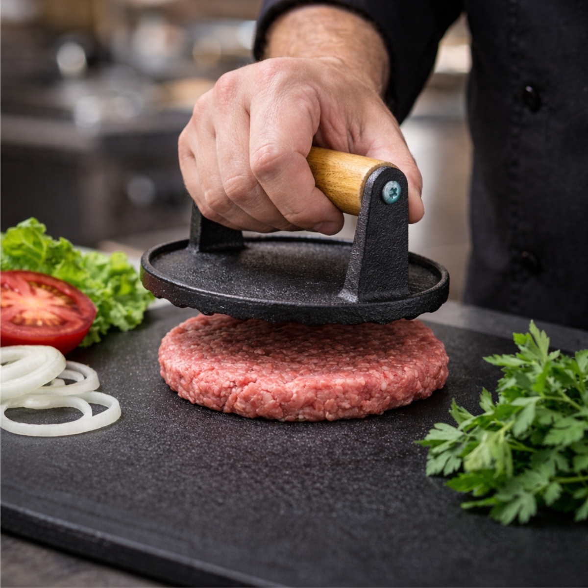 - Presă profesională din fontă pentru burgeri, carne și alte preparate la grătar