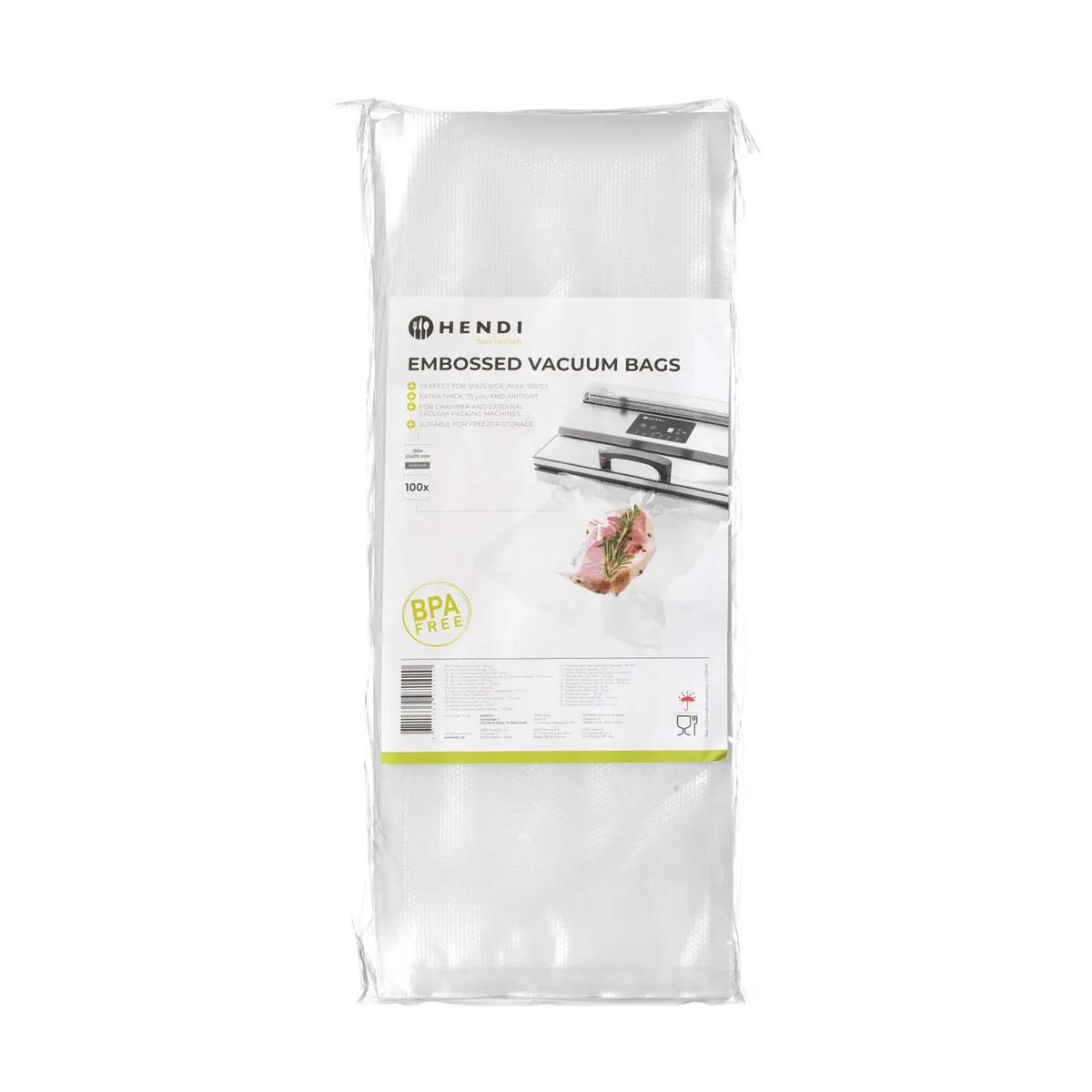 Pungile de la HENDI sunt ușor de folosit – trebuie doar să introduceți produsul în pungă și să folosiți aparatul de vidat, care elimină rapid aerul și sigilează ermetic punga. Astfel, alimentele pregătite în pungi își păstrează gustul, textura și proprietățile nutritive. Sunt potrivite atât pentru depozitare, cât și pentru gătit.