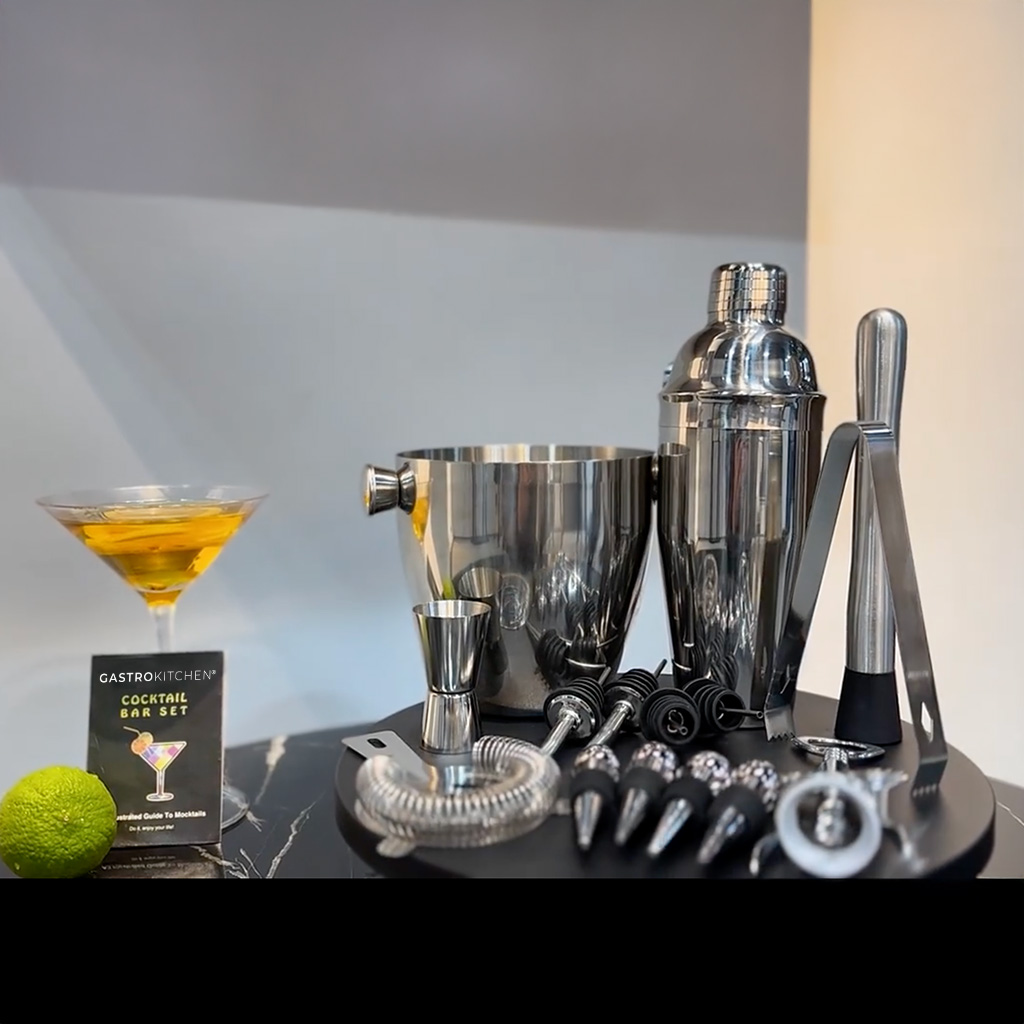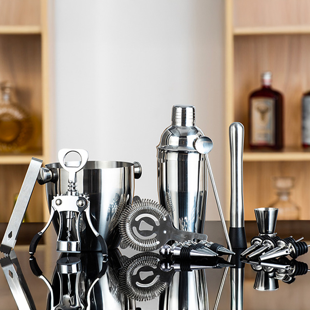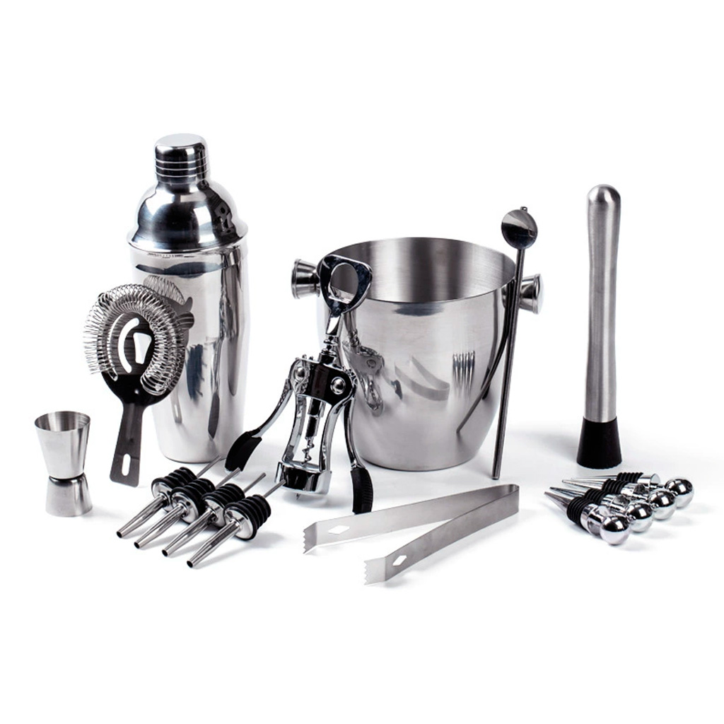 Acest set de bar este ideal pentru barmani amatori și pasionați de cocktailuri la început de drum. Include toate ustensilele esențiale pentru prepararea băuturilor preferate, fie acasă, la petreceri sau la evenimente de familie. Setul este fabricat din oțel inoxidabil 201 cu finisaj mat. Poate fi spălat în mașina de spălat vase.