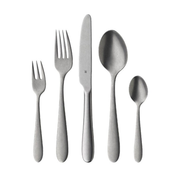 Setul de tacâmuri Sara Stone – 30 piese pentru 6 persoane | WMF îmbină un design atemporal cu un finisaj mat modern, potrivit pentru orice tip de amenajare. Datorită mânerelor late, ergonomice, oferă o prindere confortabilă și o experiență plăcută la masă.