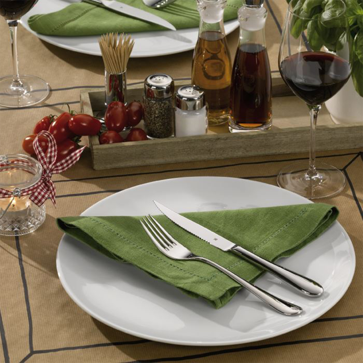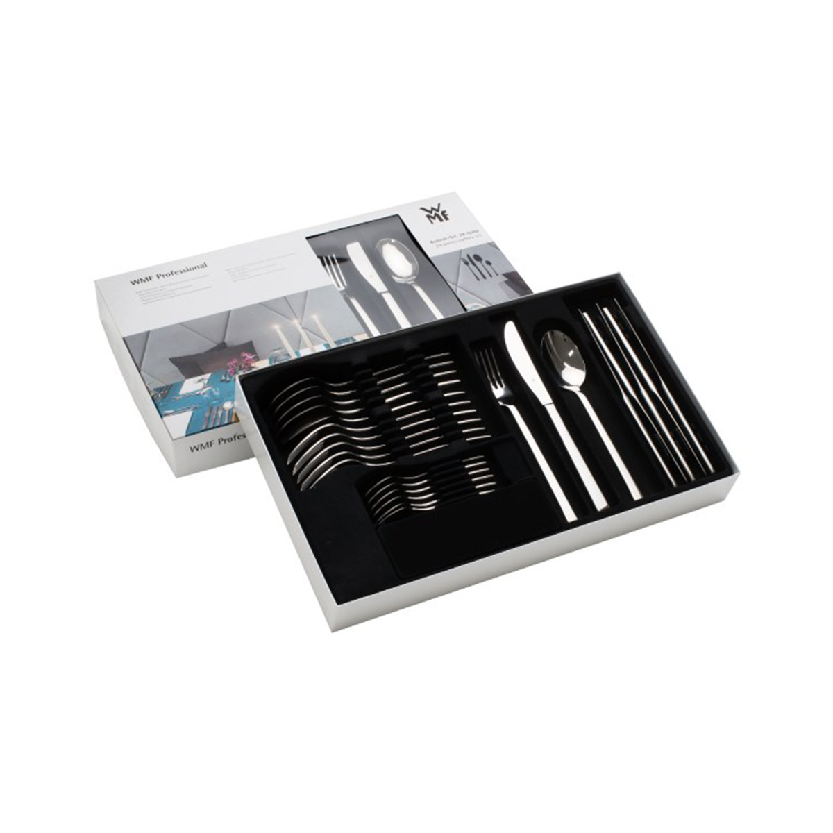 Setul premium de tacâmuri Signum 24 piese pentru 6 persoane | WMF este o soluție atemporală și versatilă pentru restaurante, hoteluri, cafenele sau acasă. Se remarcă prin linii curate, conturate clar, fără ornamente inutile, adaptându-se ușor oricărui concept de masă și oricărui tip de porțelan. Tacâmurile sunt fabricate din oțel inoxidabil Cromargan® 18/10, rezistent la coroziune și uzură mecanică.