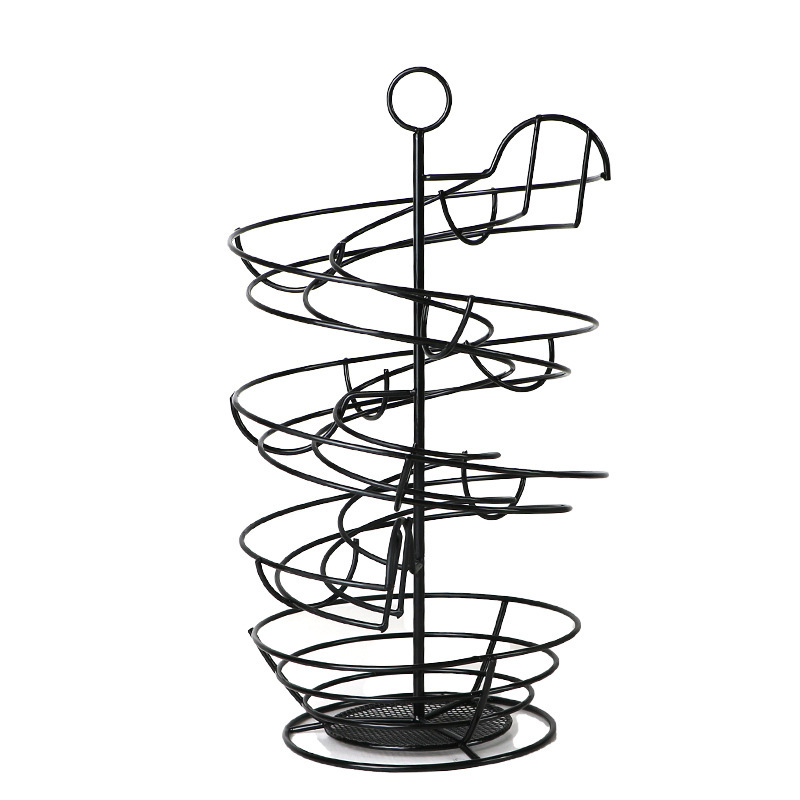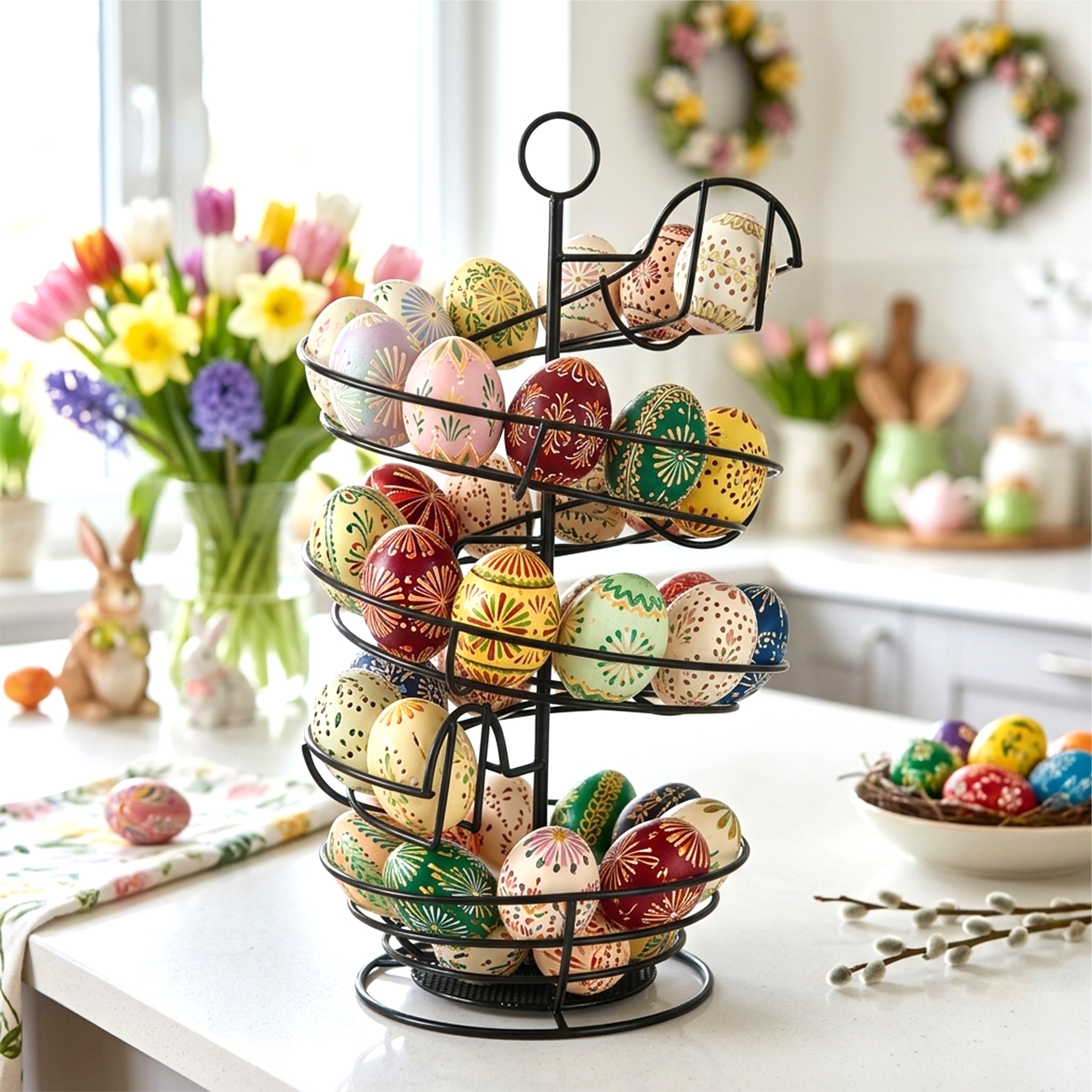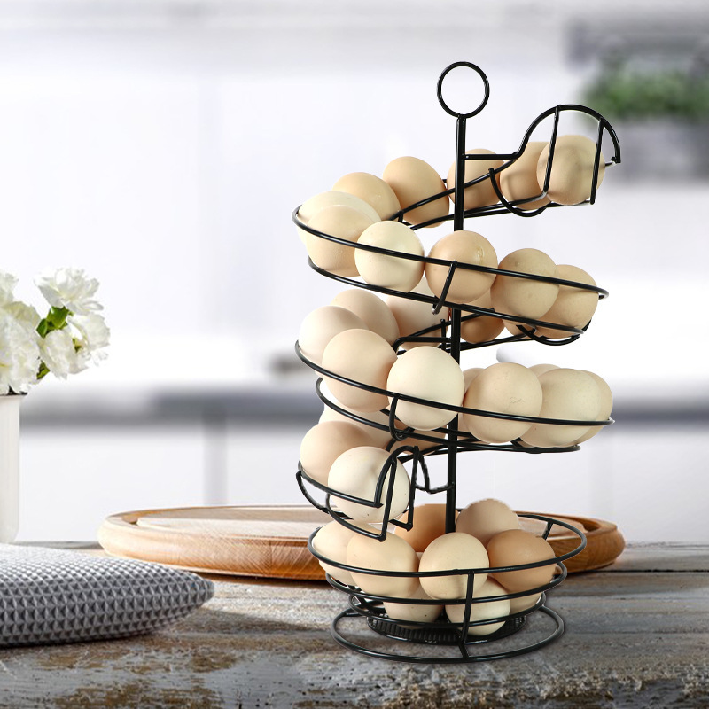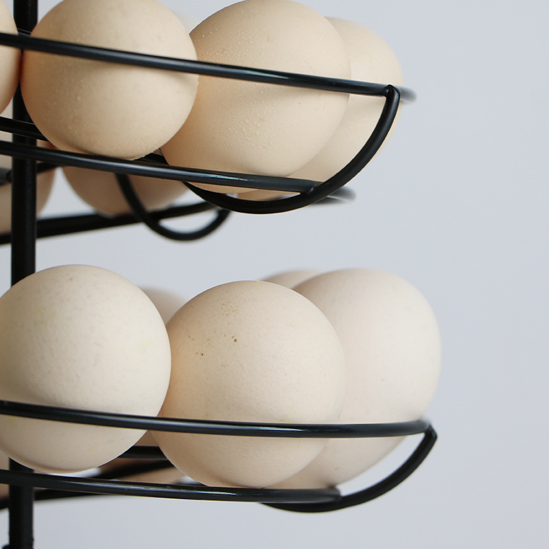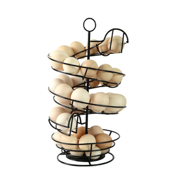 Suport bufet pentru ouă, ideal pentru depozitarea organizată și estetică a ouălor. Designul său în spirală permite utilizarea eficientă a spațiului, acces rapid la ouă și previne rostogolirea sau deteriorarea acestora. Suportul este fabricat din metal rezistent, vopsit negru, ceea ce îi asigură o durată lungă de viață și întreținere ușoară. Datorită înălțimii sale, permite depozitarea mai multor ouă, fiind perfect atât pentru uz casnic, cât și pentru cafenele, bufeturi sau restaurante unde ouăle trebuie să fie mereu la îndemână. În plus, aspectul său modern și elegant se potrivește în orice bucătărie profesională sau acasă.