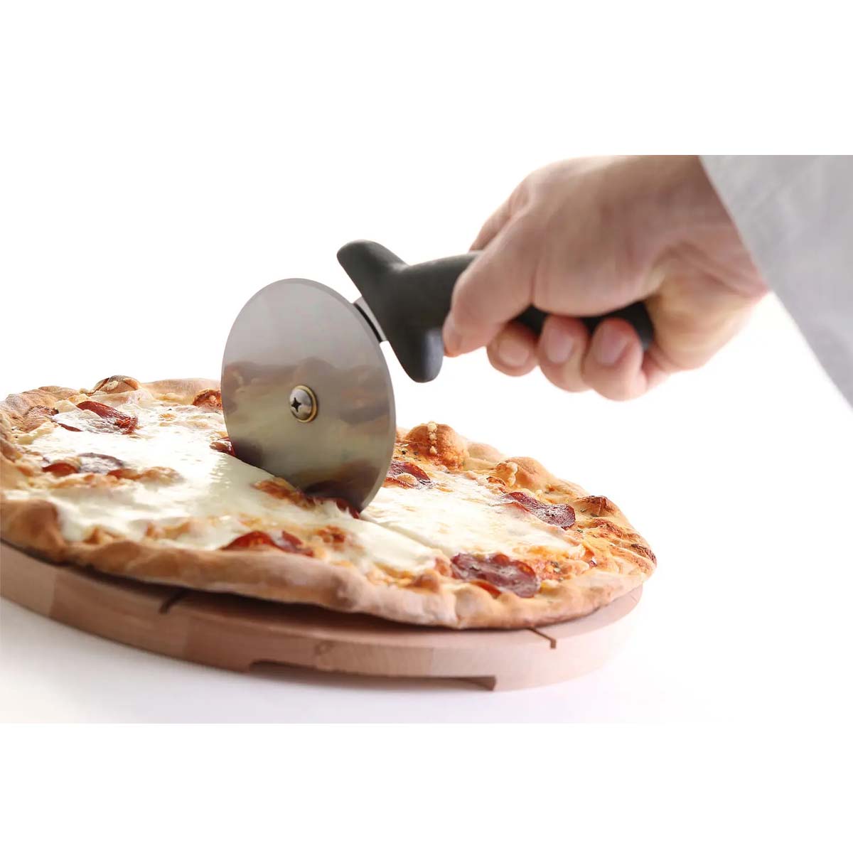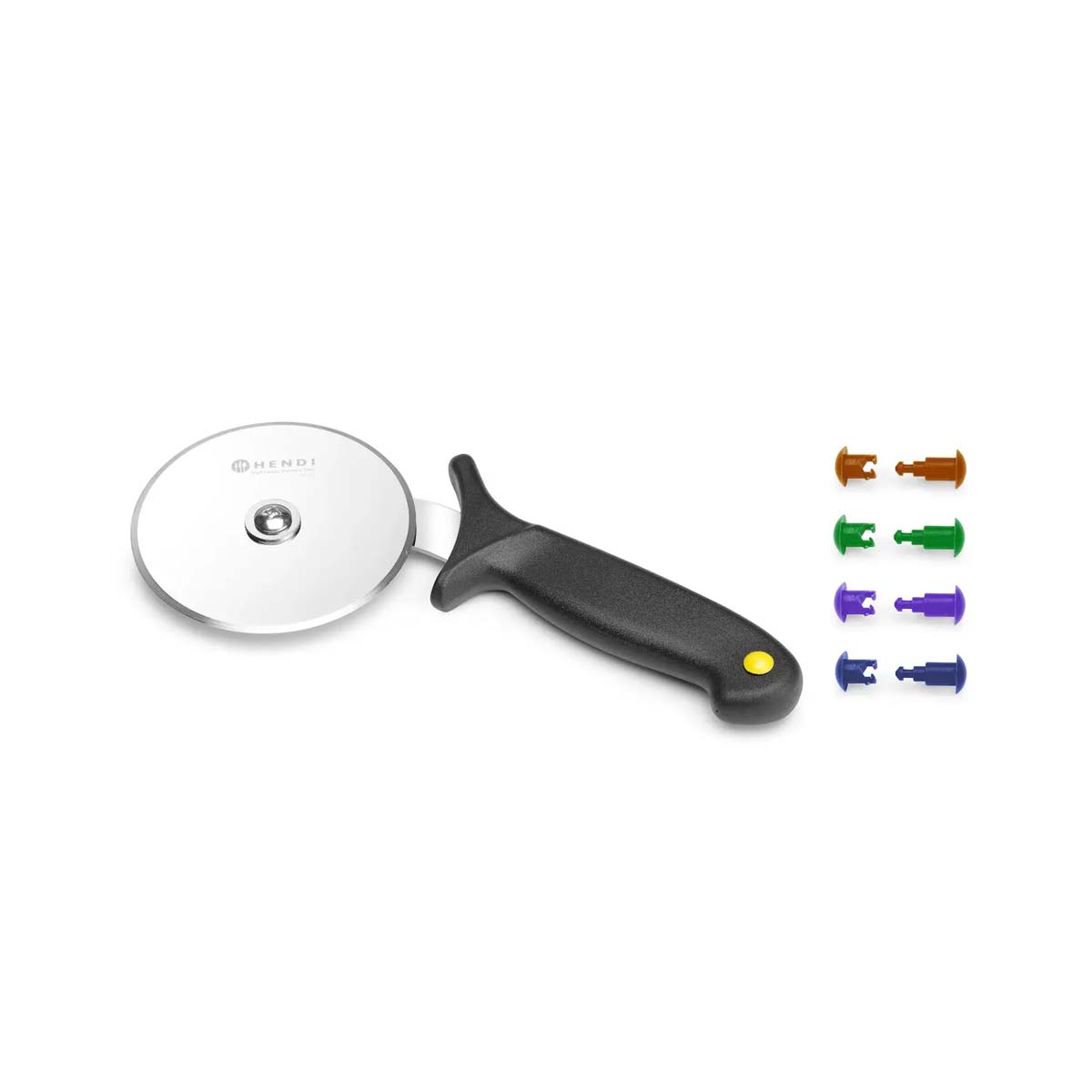 Tăietorul de pizza – 230 mm | Hendi 617014 cu lamă din oțel inoxidabil este ideal pentru pizzerii, restaurante, bufete și alte locații HoReCa. Setul include cleme pentru identificarea tăietorului.