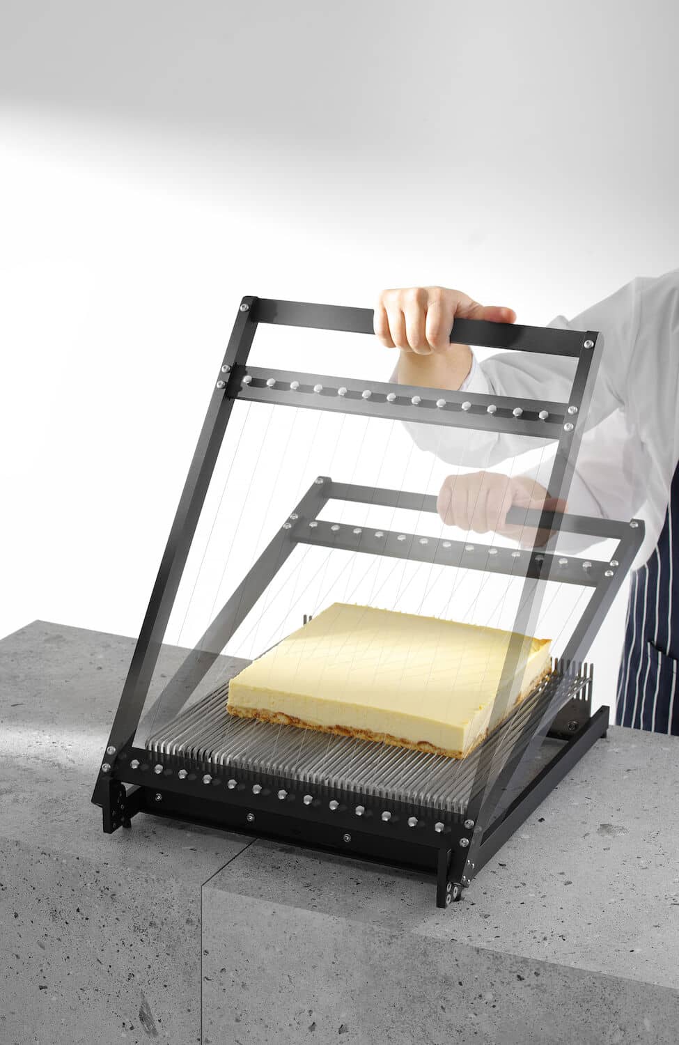 - Instrument pentru tăiere longitudinală și transversală precisă și porționare rapidă a produselor de cofetărie moi, precum ganache, budinci, mousse-uri, praline și prăjituri.