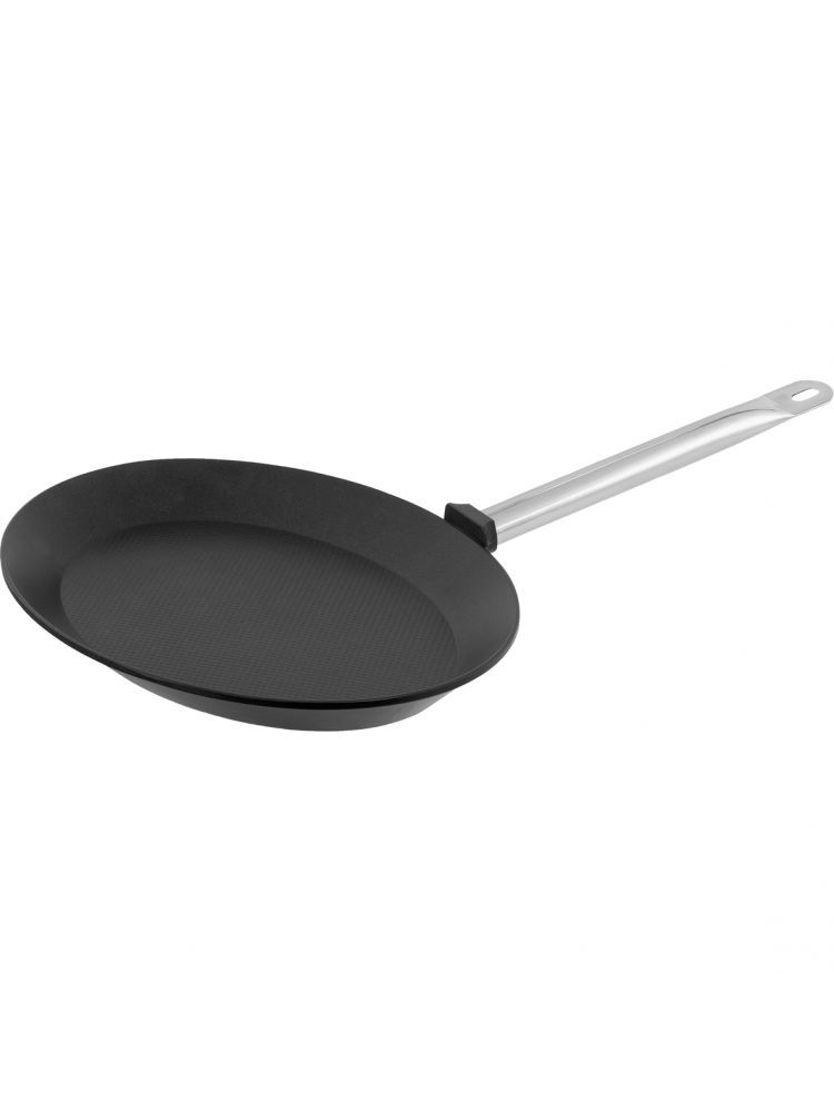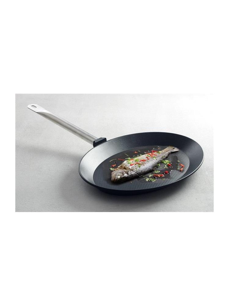 HENDI 629604 este fabricată din aluminiu, cu strat antiaderent din titan. Ideală pentru toate tipurile de plite, cu excepția celor cu inducție. Mânerul nu se încălzește, realizat din inox 18/10. Are formă ovală, perfectă pentru pește.