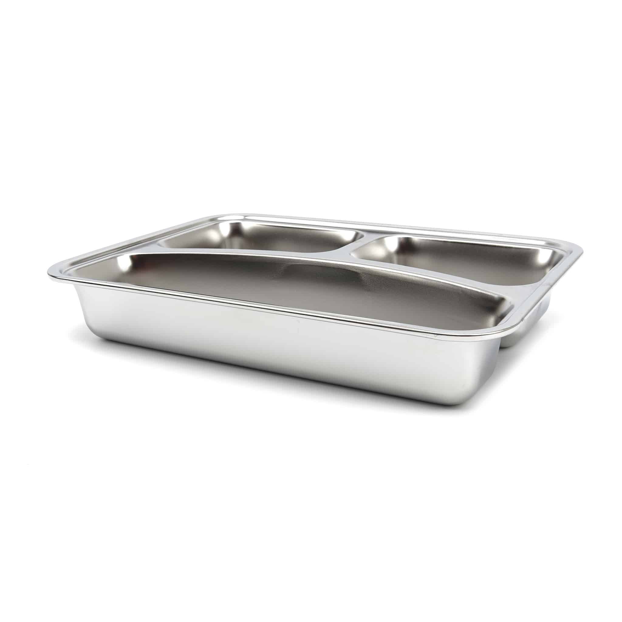 Această tavă din oțel inoxidabil are 3 compartimente practice, astfel încât alimentele pot fi depozitate separat în frigider sau congelator. Tava se curăță ușor datorită finisajului din inox. Ideală pentru cantine, spitale și servicii de catering tip catering box.