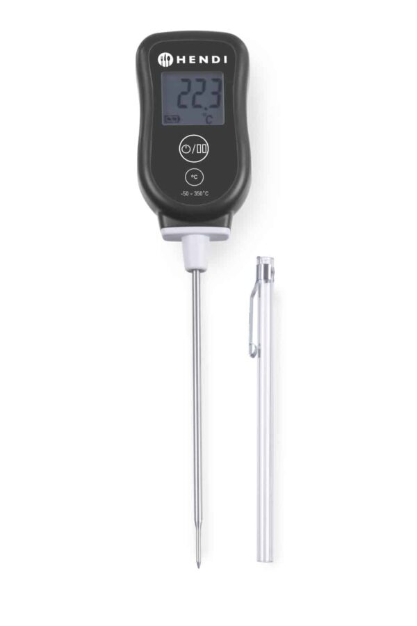 Termometru cu sondă, model HENDI 271230. Oferă citire rapidă și precisă a temperaturii. Termometrul are protecție IP 65, fiind rezistent la apă.
