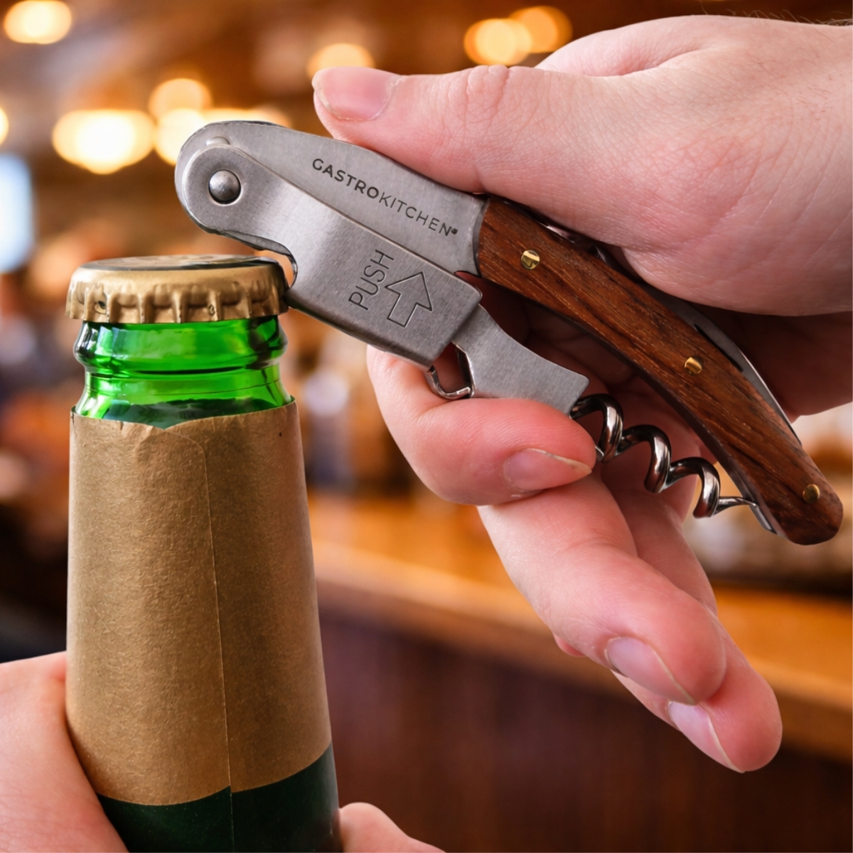 Practic, tirbușonul pentru vin cu mâner din lemn este un accesoriu de încredere pentru deschiderea rapidă și ușoară a sticlelor de vin în restaurante, baruri, cafenele sau acasă. Designul compact și pliabil asigură o utilizare comodă, depozitare și transport facil. Modelul este prevăzut și cu un deschizător de bere integrat, fiind astfel o unealtă universală pentru uz zilnic.