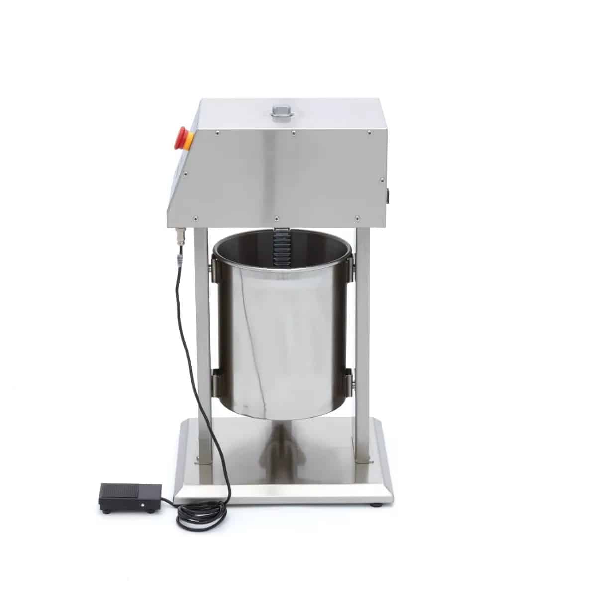 Umpleți cârnații rapid și eficient cu această umplutură automată profesională pentru cârnați, cu o capacitate de 10 litri. Aparatul este fabricat integral din inox și vine cu patru tuburi de umplere cu diametre de 16, 22, 32 și 38 mm. Include și pedală de picior pentru controlul umpluturii, astfel încât să aveți mâinile libere pentru umplere și răsucirea cârnaților. Placa de presiune are o garnitură din silicon rezistentă la scurgeri și este detașabilă. Această umplutură profesională pentru cârnați oferă 10 trepte de viteză de umplere, de la 0 la 100, astfel încât să puteți alege mereu viteza potrivită pentru dozare precisă.