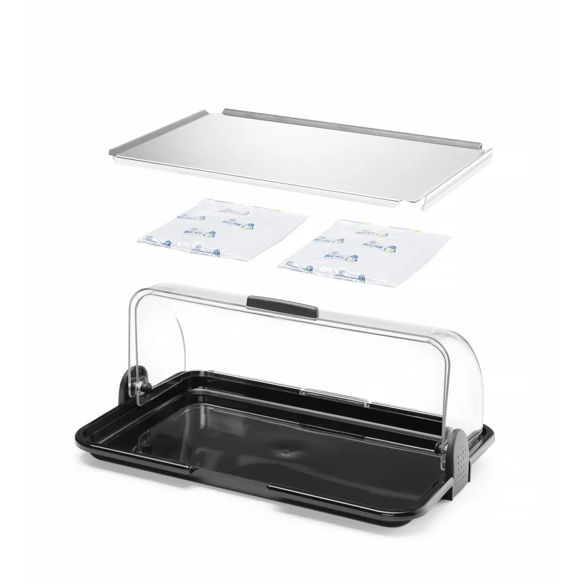Capacul transparent cu mecanism de rulare asigură acces facil la preparate din ambele părți, iar construcția din oțel inoxidabil garantează durabilitate și întreținere ușoară. Vitrina include două inserturi cu gel, care permit trecerea rapidă de la modul de răcire la cel de încălzire, în funcție de necesități.
