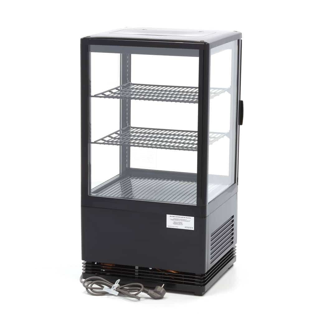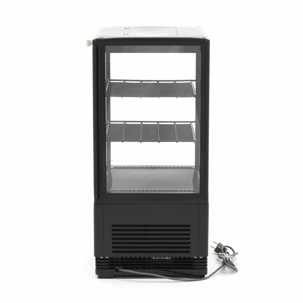 Această vitrină frigorifică robustă are o capacitate de 58 litri. Datorită celor patru geamuri și iluminării LED integrate, produsele sunt prezentate într-un mod atractiv și profesional pentru orice afacere HoReCa. În interior se află două rafturi ușor reglabile, astfel încât puteți depozita aproape orice tip de produs. Rafturi suplimentare pot fi comandate separat. Deoarece mini-vitrina este prevăzută cu încuietoare, poate fi amplasată pe bar sau pe tejghea fără grija autoservirii de către clienți.
