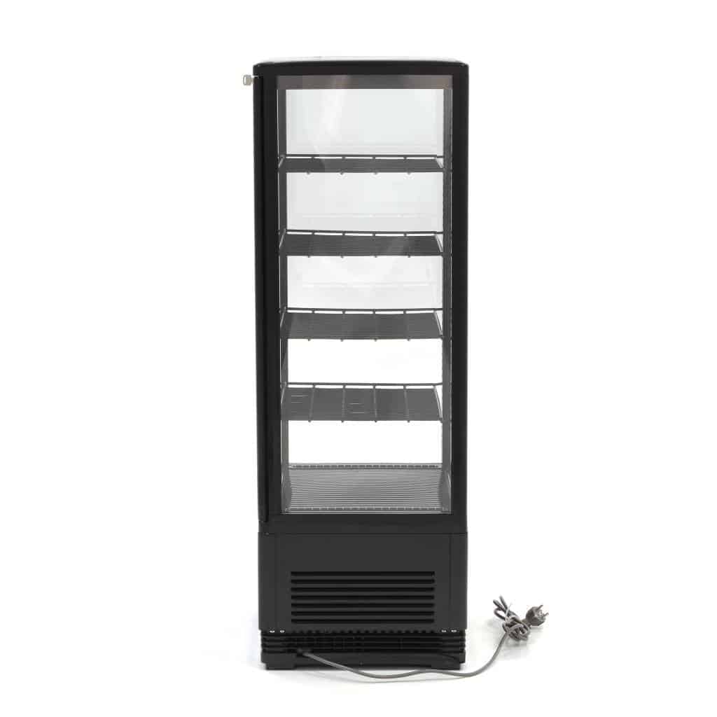 Această vitrină frigorifică robustă are o capacitate generoasă de 98 litri. Vitrina frigorifică este livrată standard cu patru rafturi. Dacă expuneți frecvent produse mici, precum doze, puteți adăuga ușor rafturi suplimentare. Datorită răcirii cu ventilator, produsele sunt menținute la aceeași temperatură indiferent de poziția lor în vitrină. Picioarele solide asigură stabilitatea echipamentului pe orice suprafață. Cele patru geamuri și iluminarea LED economică fac ca această vitrină să fie ideală pentru prezentarea produselor către clienți. Toate produsele dvs. sunt expuse într-un mod atractiv și profesional. În plus, vitrina este prevăzută cu încuietoare și două chei.