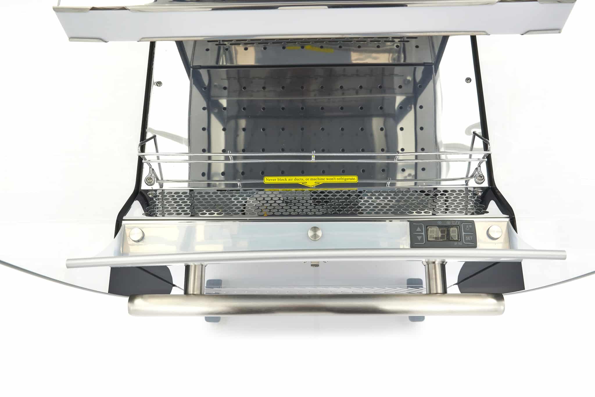 - Sistemul de răcire cu ventilator asigură distribuția uniformă a temperaturii. Alimentele și băuturile sunt răcite la aceeași temperatură pe toate rafturile.