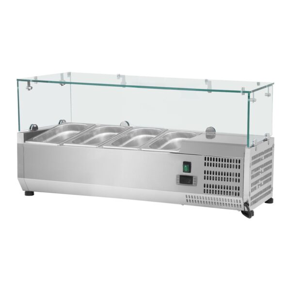 Vitrina frigorifică RCKV-120/39-G4 de la Royal Catering asigură păstrarea alimentelor mereu proaspete și atractive, fiind răcite și depozitate în condiții optime, fie pentru servire, fie pentru procesare ulterioară. Acest echipament profesional de răcire de la Royal Catering este conceput pentru restaurante, cafenele, cofetării, fast-food-uri, hoteluri și alte unități HoReCa. Este ideală și pentru pizzerii sau baruri de salate.