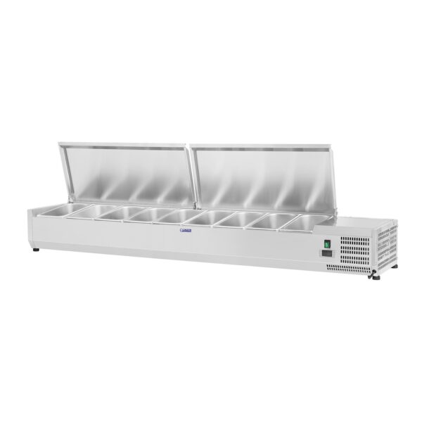 Vitrina frigorifică RCKV-200/39-S9 de la Royal Catering asigură păstrarea alimentelor mereu proaspete și atractive, fiind răcite și depozitate în condiții optime, fie pentru servire, fie pentru procesare ulterioară. Acest echipament profesional de răcire de la Royal Catering este conceput pentru restaurante, cafenele, cofetării, fast-food-uri, hoteluri și multe alte locații HoReCa. Este ideală și pentru pizzerii sau baruri de salate.